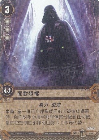 :当一个己方部队或目的卡被造成伤害时,你的对手必须将那些伤害分配到任何数量由他控制的部队和目的卡作为代替。