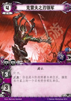 反应:你在战斗阶段部署本单位后,摧毁本行星上的一个目标受伤部队单位。